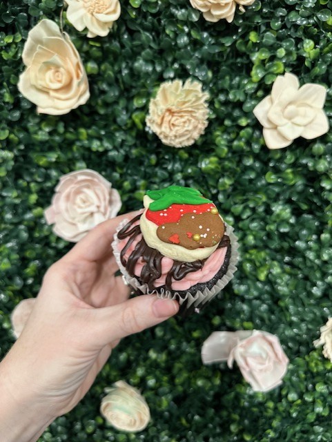 This includes 12 chocolate cupcakes, swirled with strawberry cream cheese frosting, drizzled with chocolate ganache, and topped with our famous decorated sugar cookie