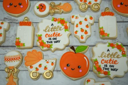 Design includes baby onesie, carriage, rattle, floral circle and “A Cutie Is On The Way” large plaque