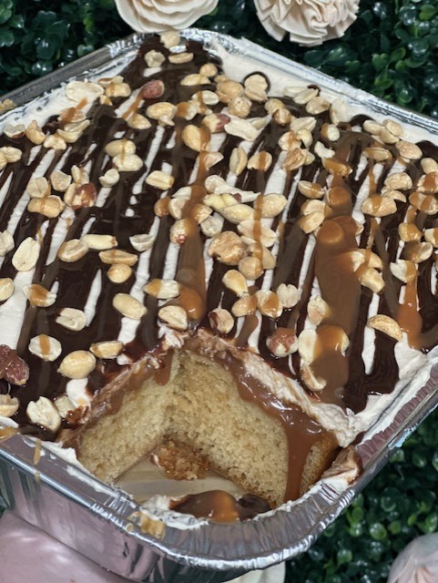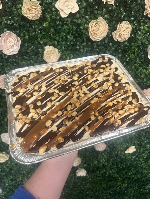 This Snickers inspired sheet cake is to DIE for! Vanilla cake swirled with caramel and baked to golden perfection. Topped with a THICC layer of our homemade salted caramel, whipped vanilla bean caramel Buttercream, house made chocolate ganache drizzle, MORE caramel sauce, and chopped peanuts for a salty crunch on top. Only available in a quarter sheet size, perfect for easy serving, sharing, or eating by yourself. :]