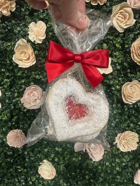 This includes 12 strawberry filled linzer cookies, dusted with powdered sugar, packaged in sets of 3, and tied with a perfect red bow!