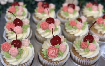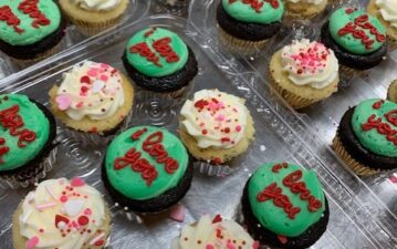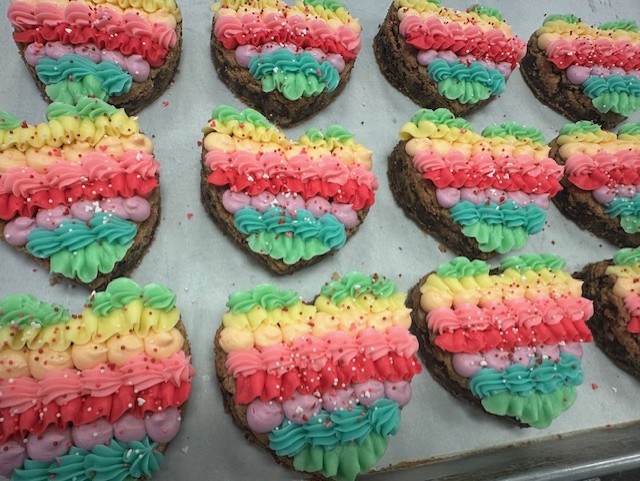 This includes 6 heart shaped, chocolate chip cookie cake squares, hand decorated with our vanilla bean buttercream.