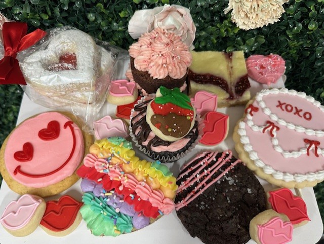 This delicious box of assorted treats is the perfect gift for your sweetie!! Included is a 3 pack of strawberry filled linzer cookies, a raspberry brownie stack, raspberry cheesecake bar, buttercream cookie, chocolate chip cookie cake heart, dark chocolate sea salt cookie, chocolate covered strawberry cupcake, a strawberry heart cake pop, and our famous decorated sugar cookies!