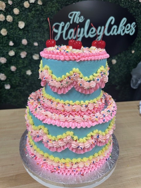 • Cake price varies by size and options. Cakes are available for store pick up only or local delivery by courier. Call the bakery for courier availability. Please be aware, if you order a House Favorite Flavor that has a colored buttercream (such as lemon buttercream or chocolate buttercream), we may have to substitute it for vanilla buttercream in order to make the cake the colors you request.
